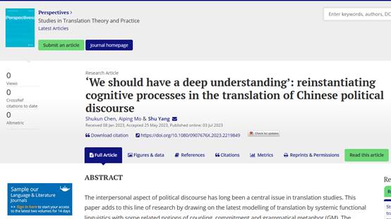 近日,我校星空网彩票教师陈树坤博士的最新研究成果“‘We should have a deep understanding’: reinstantiating cognitive processes in the translation of Chinese political discourse”在《Perspectives: Studies in Translation Theory and Practice》上正式刊发。《Perspectives》是国际译学界公认的最具影响力的翻译学期刊之一,系国际顶尖翻译学学术刊物,在2023版语言学SSCI期刊以1.3影响因子位列2区。陈树坤为该成果的第一作者,星空篮球体育为第一单位。