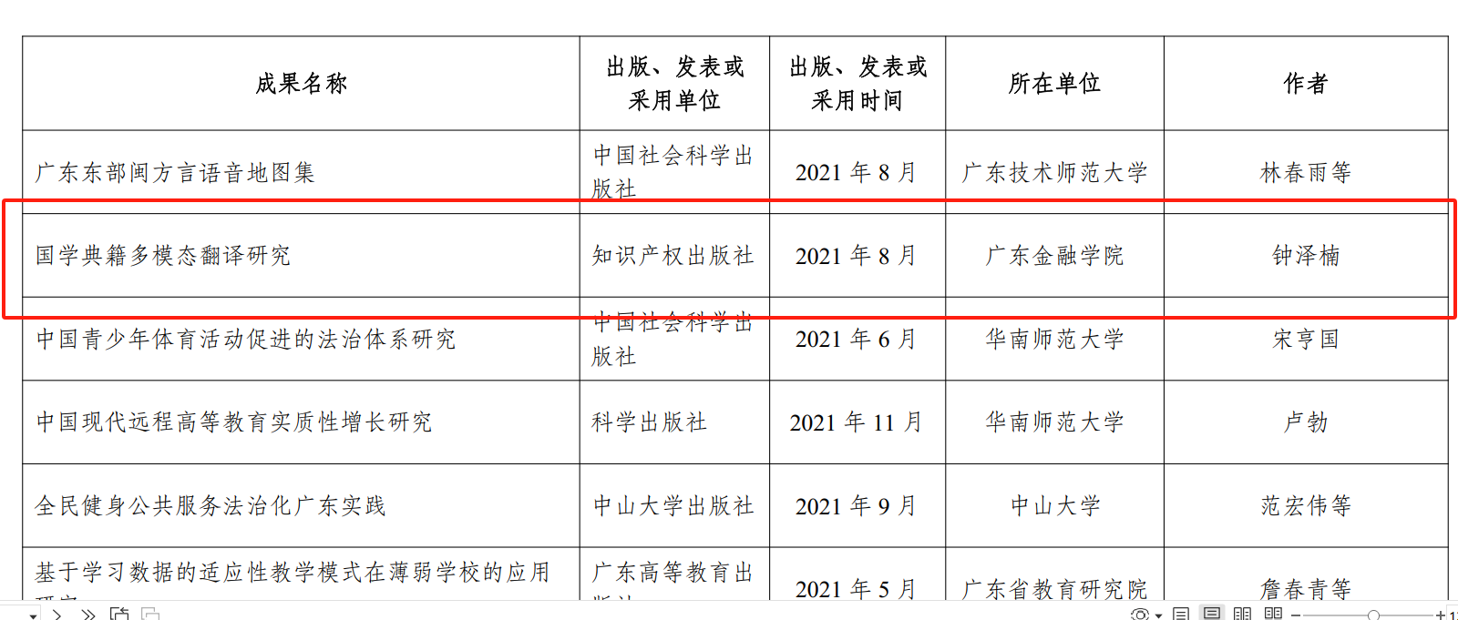 近日,由广东省哲学社会科学规划领导小组批准,广东省哲学社会科学优秀成果评奖工作办公室组织的第十届广东省哲学社会科学优秀成果奖评选公示结果。我校星空网彩票钟泽楠老师的专著《国学典籍多模态翻译研究》荣获著作类成果三等奖。