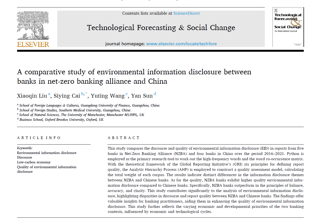 近日,外文学院刘晓琴博士以及其研究团队成员在管理学和商科领域的顶级期刊Technological Forecasting & Social Change上发表了一篇题为“A comparative study of environmental information disclosure between banks in net-zero banking alliance and China”的学术论文,这一成果标志着我院在充分利用大学优势学科资源的基础上,在跨学科研究领域取得了显著进展,特别是在聚焦银行金融业话语研究方面实现了重大突破。