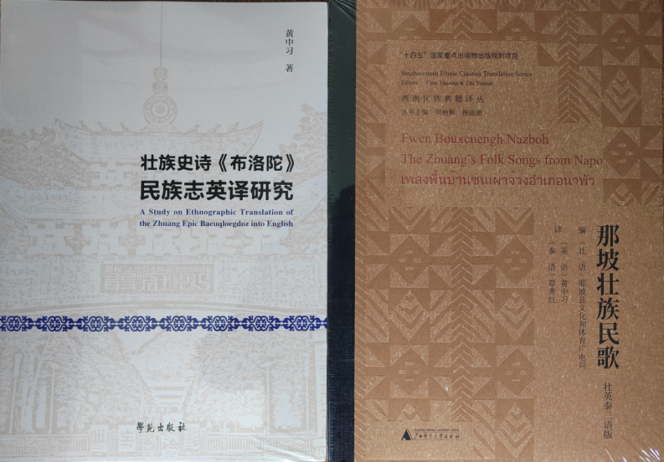 近日,我院黄中习教授的民族翻译研究新著译作《壮族史诗〈布洛陀〉民族志英译研究》和《那坡壮族民歌》(壮英泰三语版,英语译者)已经出版,是“铸牢中华民族共同体的文化译介新探索”。其中,前者是国家社科基金项目研究的代表成果,入选了少数民族民间文学研究“年度书目”,首次系统梳理壮族史诗《布洛陀》从经诗到麽经、史诗的历史流变,并创新探讨其民族志对外译介路径;后者是国家《出版业“十四五”时期发展规划·西南民族典籍译丛》的系列成果之一,多语对外译介国家级非物质文化遗产——广西那坡民歌。