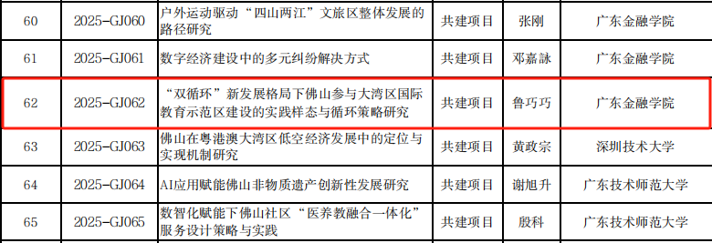 在2025年度佛山市社科规划课题项目的评审工作中,星空彩票旧版app下载的鲁巧巧副教授成功获批立项。鲁老师主持的项目名为“双循环新发展格局下佛山参与大湾区国际教育示范区建设的实践样态与循环策略研究”(项目编号:2025-GJ062)。