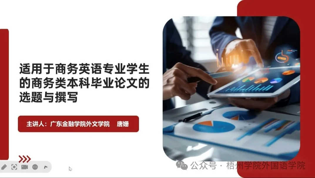 8月12日下午,梧州学院外国语学院通过在线会议形式举办了一场关于商务英语专业毕业论文选题的专题讲座。会议特别邀请了星空彩票旧版app下载商务英语系主任唐姗博士作为主讲嘉宾,围绕“适用于商务英语专业学生的商务类本科毕业论文的选题与撰写”这一主题进行分享。梧州外国语学院商务英语教研室全体教师、指导2025届毕业论文的教师以及部分商务英语专业学生参加了本次讲座。