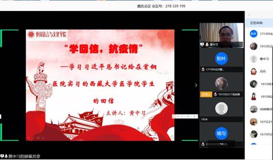 4月24日中午,外文学院师生党员、入党积极分子代表等129人齐聚腾讯课堂共同开展以“勇挑重担,齐心抗‘疫’”为主题的学习习近平总书记给首钢医院实习的西藏大学医学院学生回信的活动。外文学子悟总书记回信精神,用实际行动践行党员初心使命,体现责任担当,让党旗高高飘扬在疫情防控斗争的第一线。