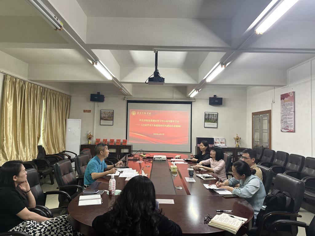 为贯彻落实《中共中央办公厅关于在全党开展深入贯彻中央八项规定精神学习教育的通知》和学校党委部署要求及学院学习教育实施方案,4月27日上午,星空网彩票在学院2417会议室召开了学院党委理论学习中心组专题学习会,深入学习领会中央八项规定及其实施细则精神和《习近平关于加强党的作风建设的论述摘编》。