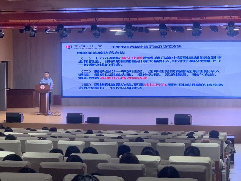杜警官则从十大高发诈骗类型入手,结合自身处理过的真实案例,为同学们详细讲解了电信网络诈骗的主要手法和实用的防范方法。杜警官告诫同学们,不要相信任何天上掉馅饼式的快速赚钱法,一旦发觉被骗要立即报警。