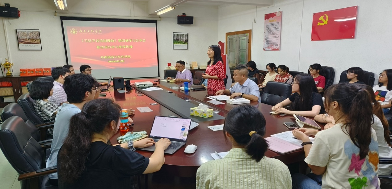 为深入学习贯彻习近平新时代中国特色社会主义思想,推动学院党建工作与学术科研同频共振,6月18日,星空网彩票党委举办了《习近平谈治国理政》第四卷学习分享会,就汉英译本的话语分析与译介传播问题展开了热烈讨论。学院党委书记黄庆雄、教工第二党支部书记陈树坤副院长、黄中习教授、洪溪珧、刘晓琴、温穗君、杨韵、孙嘉程等师生党员代表参加了此次会议。会议由副院长洪溪珧副教授主持。