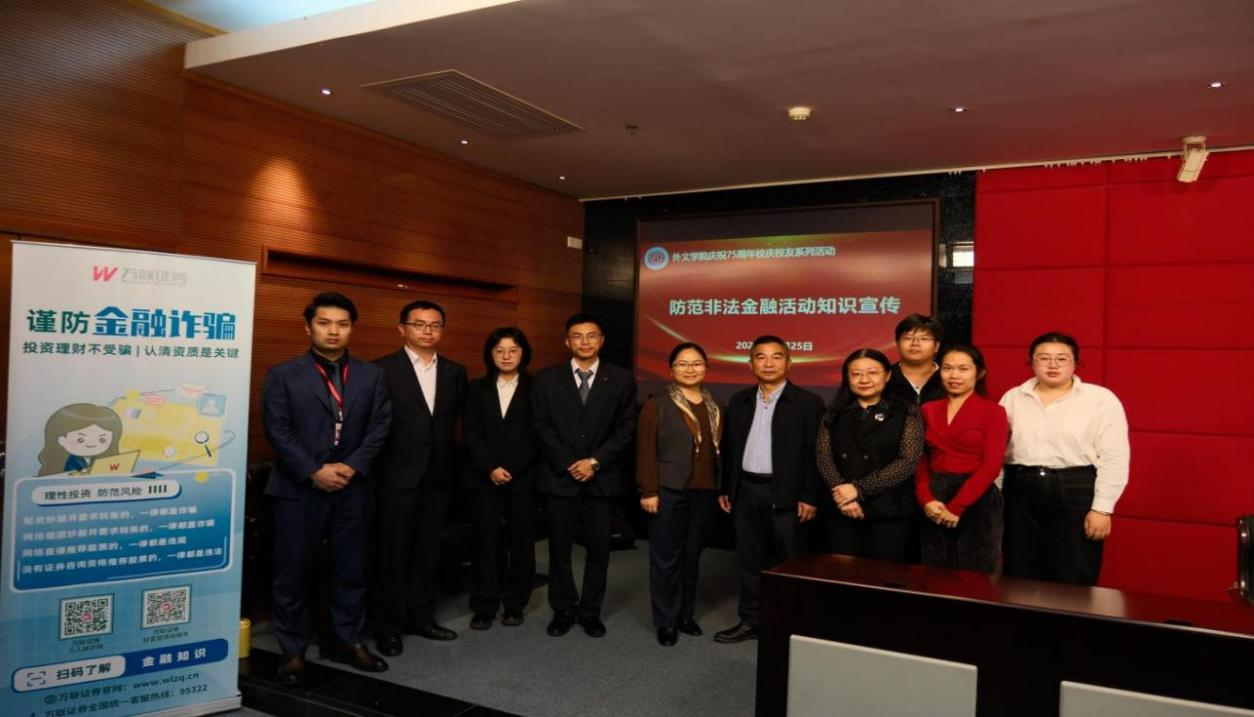 为庆祝学校建校75周年,凝聚校友力量,展示优秀校友风采,切实提升外文学院广大师生金融安全意识,防范非法金融活动风险,11月25日,星空网彩票在新电二楼学术报告厅成功举办“防范非法金融活动暨职业规划”专题讲座。本次活动特邀外文学院2008届校友、万联证券佛山顺德证券营业部宋燕飞总经理及其团队担任主讲嘉宾,旨在增强学生金融安全意识,拓宽外语专业学生的职业发展视野。外文学院党委书记黄庆雄、党委副书记王丹、辅导员邓伟琦、李春蓉、孙嘉程和150余名学生代表参加了活动。