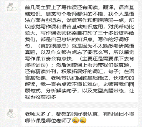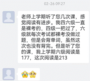 实证有效:据往届学生反馈,凡坚持上课并认真完成学习任务的同学,普遍收获颇丰:大学英语四六级成绩明显跃升,尤以阅读与写作提分最为突出。有同学在考研英语中获得了81分的高分。