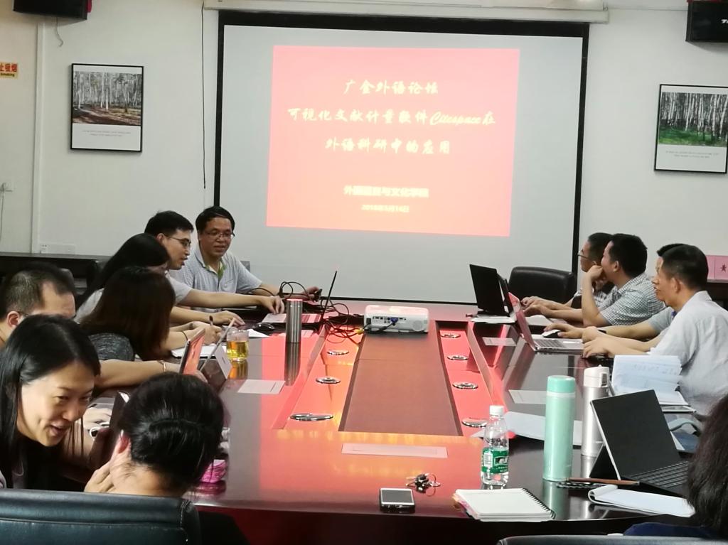2018年5月16日下午,外文学院举办“广金外语论坛”之“可视化文献计量工具Citespace在外语科研中的应用分享会”,全院近40位教师积极报名,参与了论坛分享活动。会上,黄中习教授、林菁博士和陈树坤博士分别就Citespace的介绍与运用作了报告和答疑。黄中习首先演示如何借用Citespace进行汪榕培学术思想的课题研究,图文并茂地展示了相关研究初步成果;林菁讲解Citespace的基础知识和写作方法;最后陈树坤以“词典学”为例,为大家演示Citespace的具体操作方法和技巧。