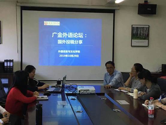 2019年10月29日下午,外文学院举行“广金外语论坛”,邀请刘晓琴、钟泽楠和陈树坤三位在SSCI刊物发表过论文的教师分享英文学术论文写作和国外投稿经验,系部主任、青年博士以及新进教师等20余人参加了本次论坛。