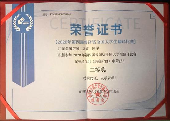 为贯彻《教育部关于全面提高高等教育质量的若干意见》,配合《中国英语能力等级量表》的实施和推广,以语言应用为导向,为大学生提供展示英语应用能力平台,激发大学生学习英语的积极性,第四届“普译奖”全国大学生翻译比赛于2020年5月份举行,我院19级翻译专业唐睿同学(191598212)荣获英译汉组二等奖。
