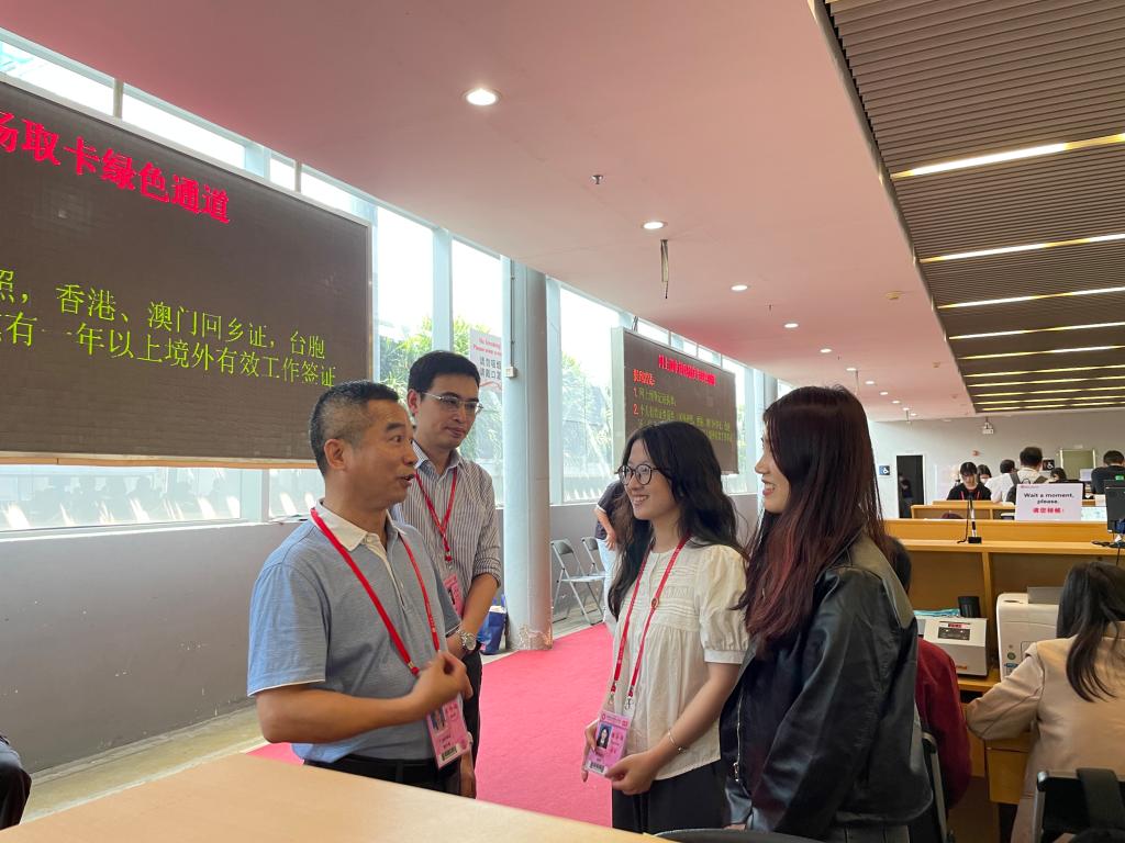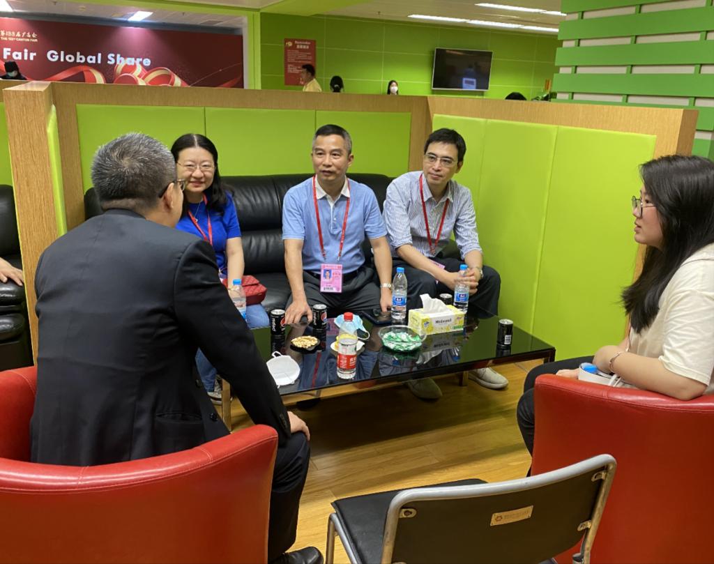 广州第133届交易会于4月15日隆重开幕,本届广交会我院共派出107名2020级学生参加实习实践,负责境外采购商办证、咨询导向、展厅咨询、广交会调研、组展事务运营等多个岗位的工作。为深入了解学生在广交会岗位实习情况,调研企业用人需求,稳步推进校企合作,提升教育教学质量,促进学校高质量发展,4月17日下午,外文学院党总支书记黄庆雄、副书记王丹、副院长陈树坤、辅导员李春蓉一行4人到广交会琶洲展馆走访调研。