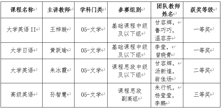 在本次大赛中,星空网彩票积极组织教师参加比赛,共获得两项一等奖、一项二等奖与一项三等奖的好成绩。王梓璇主讲的《大学英语 II》课程和黄跃瑜主讲的《大学日语》课程荣获一等奖;朱冰霞主讲的《大学英语》课程摘得二等奖;孙智慧主讲的《高级英语》课程获得三等奖。