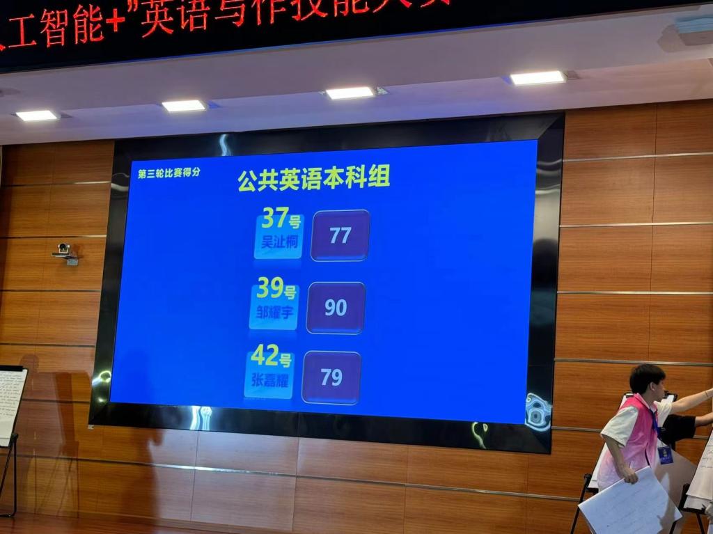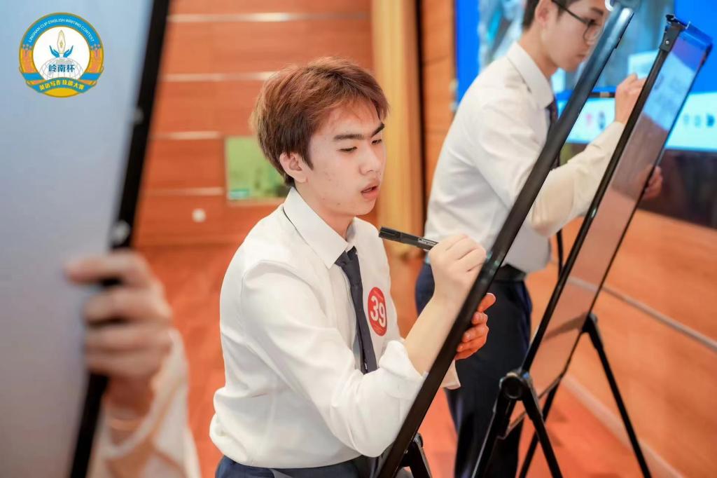 第三轮:看图作文(8分钟即兴写作)。选手根据现场公布的题目和图片在题板上即兴写作,满分100分。邹耀宇同学凭借其深厚的语言基础和丰富的写作经验,奋笔疾书,获得现场四位评委合议给出的小组最高分90分。