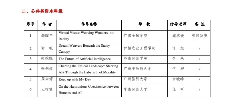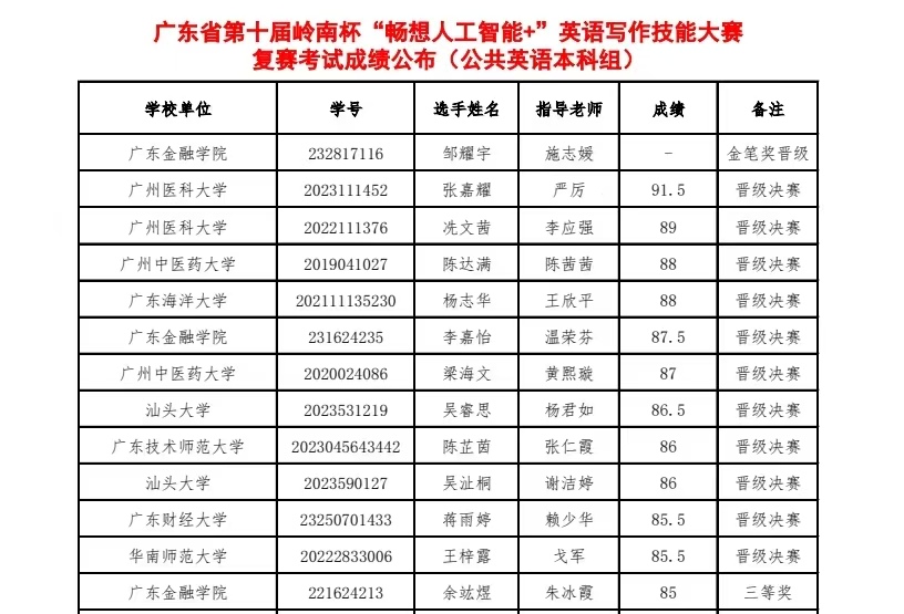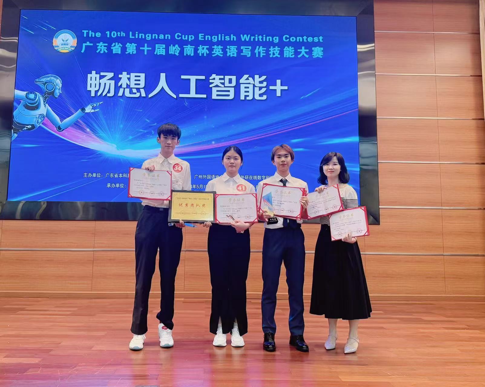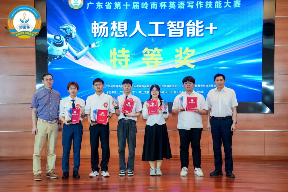 2024年5月18日,第十届岭南杯“畅想人工智能+”英语写作技能大赛决赛暨颁奖典礼在广东财经大学成功举行。我校邹耀宇(232817116)同学发挥出色,荣获公共英语本科组特等奖,继2023年我校学子在该组别竞争中的又一佳绩,成功卫冕公共英语本科组的唯一特等奖。余竑煜(221624213)和李嘉怡(231624235)两位同学荣获二等奖,吕昆瀚(23281E14)和区苑琳(211617204)两位同学荣获三等奖。我校获得优秀团队奖。