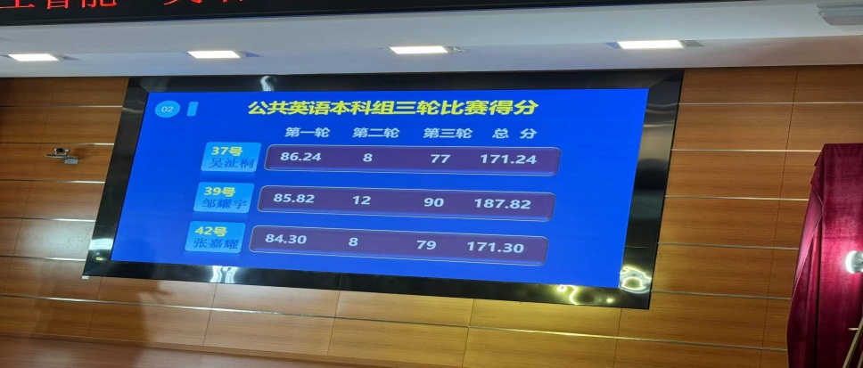 最终,邹耀宇同学以决赛三轮总分第一187.82分夺得公共英语本科组的特等奖,卫冕成功,施志媛老师荣获特等奖优秀指导老师奖,朱冰霞,温荣芬,何艳娜和林小惠四位老师获得优秀指导老师奖。星空篮球体育获得优秀团队奖。