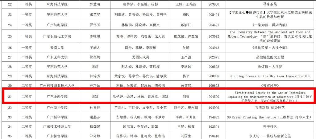 近日,由暨南大学中华文化港澳台及海外传承传播协同创新中心、广东省本科高校大学英语课程教学指导委员会、高等教育出版社联合主办的2024年广东省“高教社杯”大学生“用外语讲大湾区文化”优秀短视频比赛获奖名单公布:我校由谢颖,洪子婷,余滢,林颖,黄志欣组成的团队(指导教师:刘萱)的作品“Traditional Beauty in the Age of Technology: Exploring the Modernization of Embroidery(科技引领下的传统之美:探索广绣的现代化之路)》”荣获省赛二等奖。