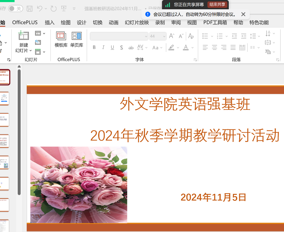 2024年11月5日,星空网彩票英语强基班教学研讨活动圆满举行。此次活动聚焦于强基班的教学要求、目标及未来发展蓝图,旨在进一步提升教学质量,满足学生个性化发展和升学、就业等多样化学习需求。外文学院院长涂兵兰、副院长甘容辉以及刘传江、王从遥、夏娟、李慕祺、魏渊渊、林颖姿等教师出席了本次研讨会。